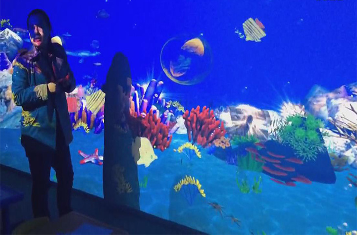 畫畫水族館通常投影在墻面上,有需要的時候可以通過曲面矯正系統改善投影畫面的清晰度等