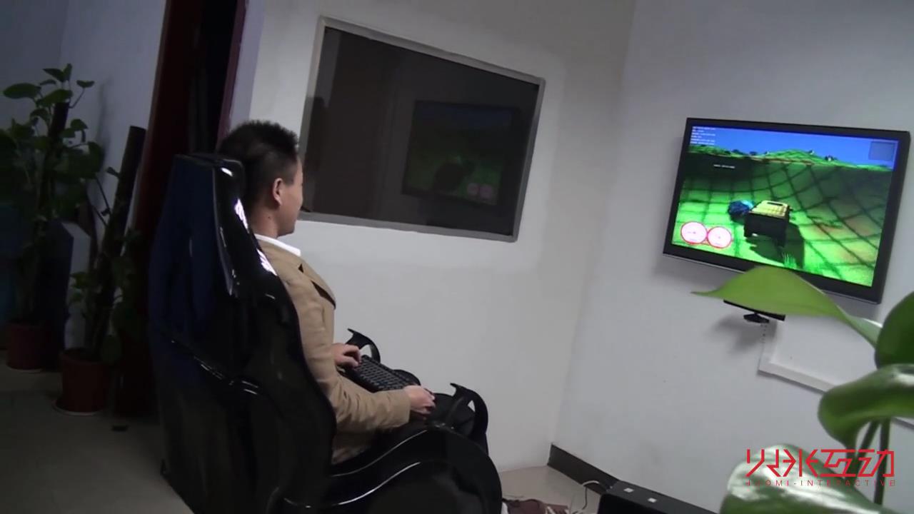 視頻中展示的是4D影院中的動感座椅,根據游戲的故事情節,由計算機控制做出特技效果,可以帶來震動、顛簸等特效。從而調動了認得感知系統,使參與者仿佛真的參加了這個游戲,非常驚險刺激,帶來身臨其境的體驗感。