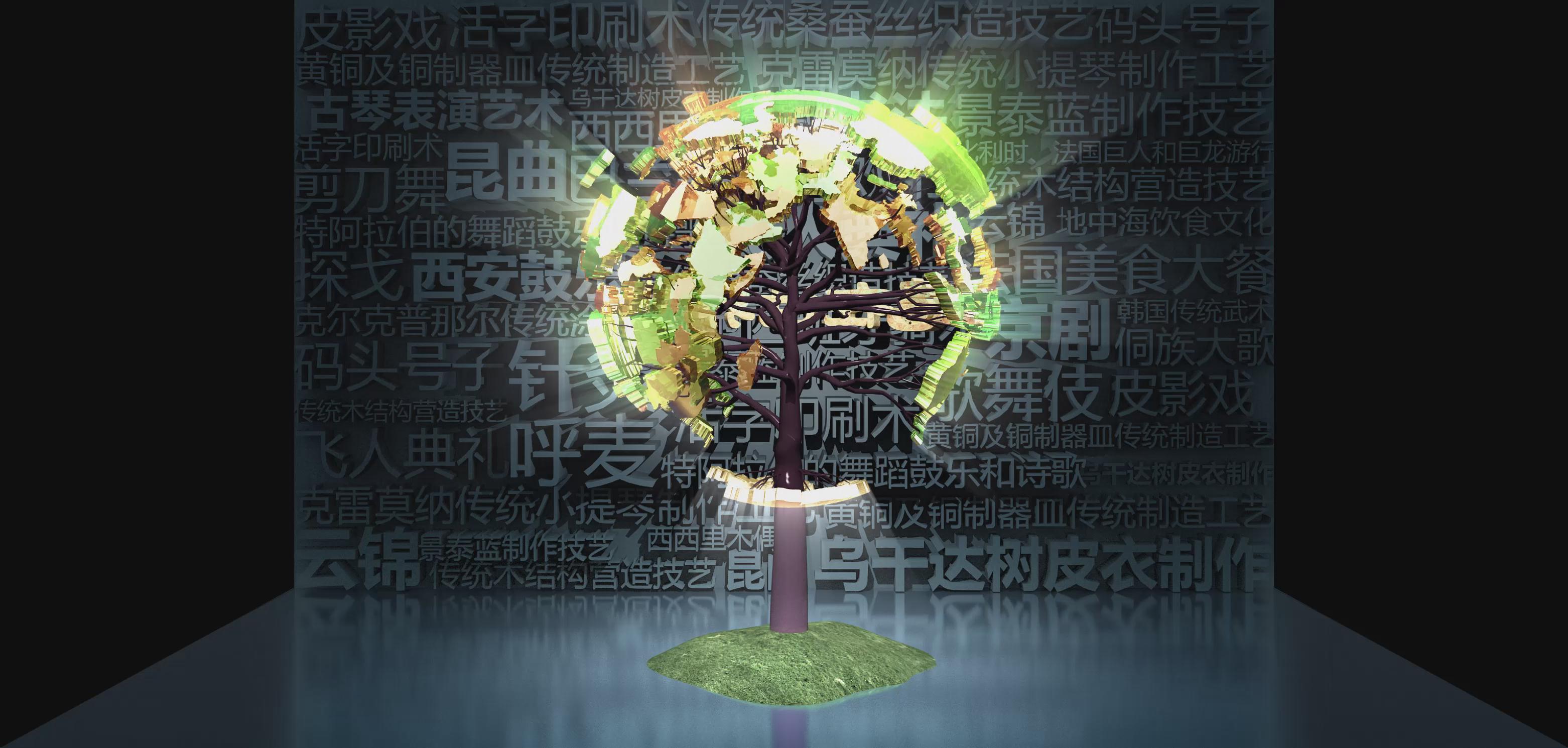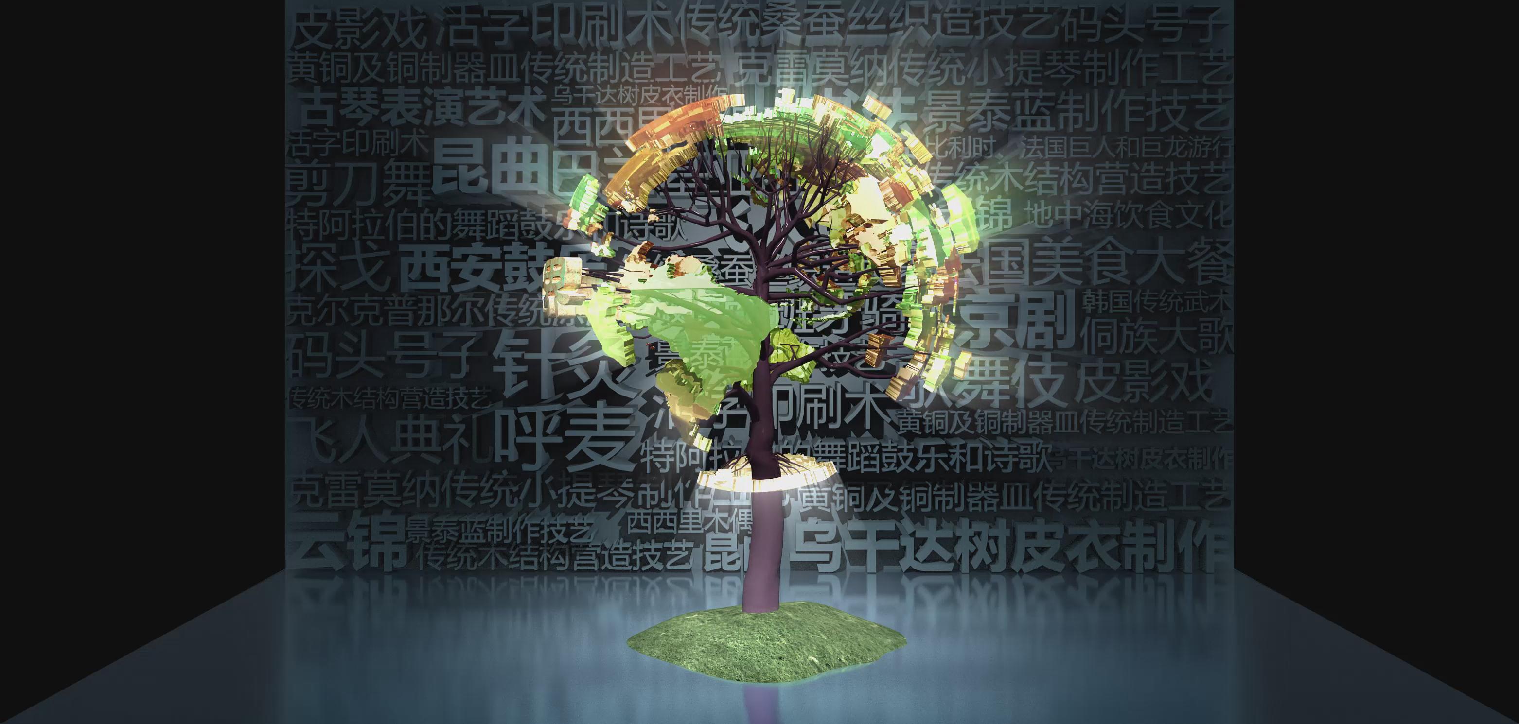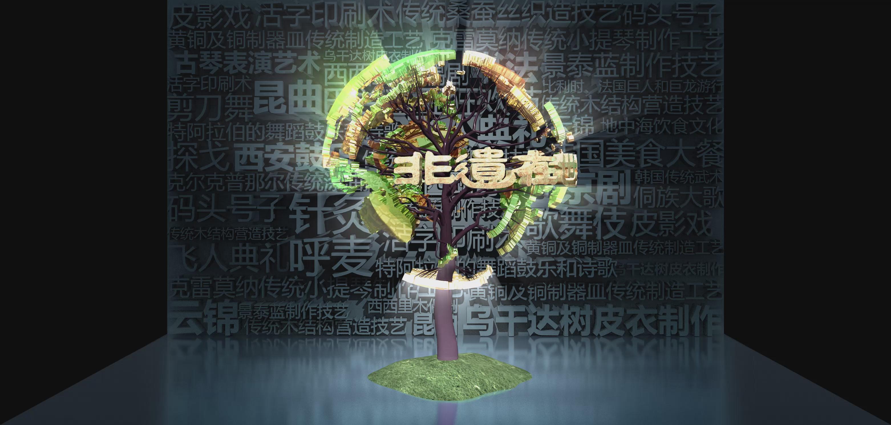 截止2017年6月,中國(guó)已有39個(gè)項(xiàng)目躋身世界級(jí)非物質(zhì)文化遺產(chǎn),項(xiàng)目總數(shù)位居世界第一。其中,人類非物質(zhì)文化遺產(chǎn)代表作名錄31項(xiàng),急需保護(hù)的非物質(zhì)文化遺產(chǎn)名錄7項(xiàng),非物質(zhì)文化遺產(chǎn)優(yōu)秀實(shí)踐名冊(cè)1項(xiàng)。 以折幕形式向大眾展示世界非物質(zhì)文化遺產(chǎn),在背景圖中列出了多種非遺事項(xiàng),結(jié)合立體模板大樹(shù)的形式,讓大家可以了解中國(guó)的非遺項(xiàng)目。